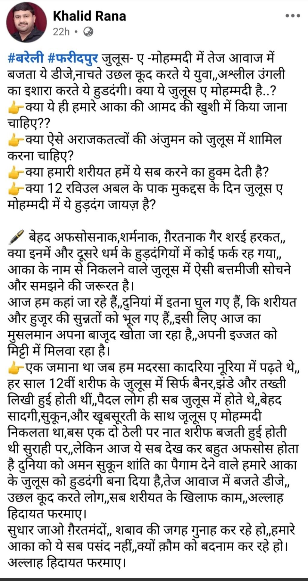 बरेली के फरीदपुर कस्बे में 12 रबीउल अव्वल पर निकले जुलूस-ए-मोहम्मदी में अनुचित घटना सामने आई है। जुलूस के दौरान बिना अनुमति बजाए गए डीजे पर कुछ युवकों की अभद्र हरकतों का वीडियो सोशल मीडिया पर वायरल हुआ है।