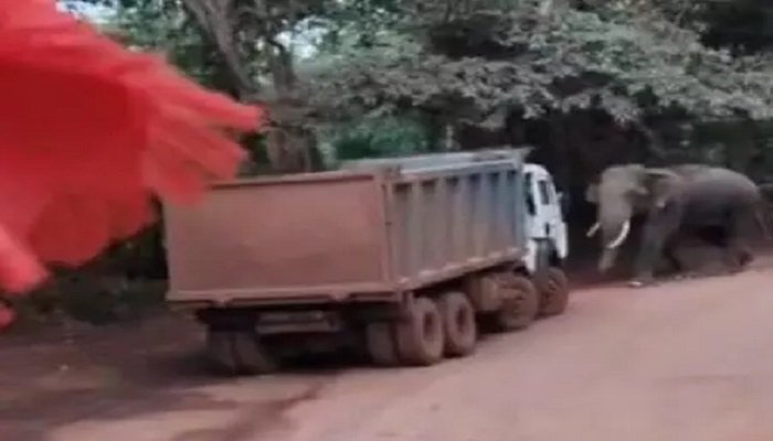 सड़क पर हाथी की दहशत: हाईवा का रास्ता हाथी ने रोका ड्राइवर ने समय रहते पीछे करके बचाई जान, वन विभाग अलर्ट