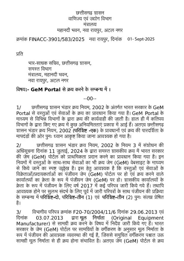 मूल्य 50 हज़ार से कम राशि की वस्तु/सेवा के क्रय में नियम 4.3.1 अंतर्गत जेम (GeM) पोर्टल से भिन्न माध्यम से क्रय के विषय में जारी विभागीय पत्र क्रमांक 3881/3296/2024/11/6 दिनांक 20.11.2024 को अधिक्रमित करते हुए स्पष्ट किया जाता है कि छत्तीसगढ़ शासन भंडार क्रय नियम, 2002 के नियम 3 अनुसार जेम (GeM) पोर्टल पर उपलब्ध वस्तु सेवा का क्रय जेम (GeM) पोर्टल के माध्यम से ही किया जाए। किसी विशेष परिस्थिति में भी, नियम 3 अनुसार, वित्त विभाग की पूर्व अनुमति के बिना अन्य माध्यम से क्रय नहीं किया जाए।
