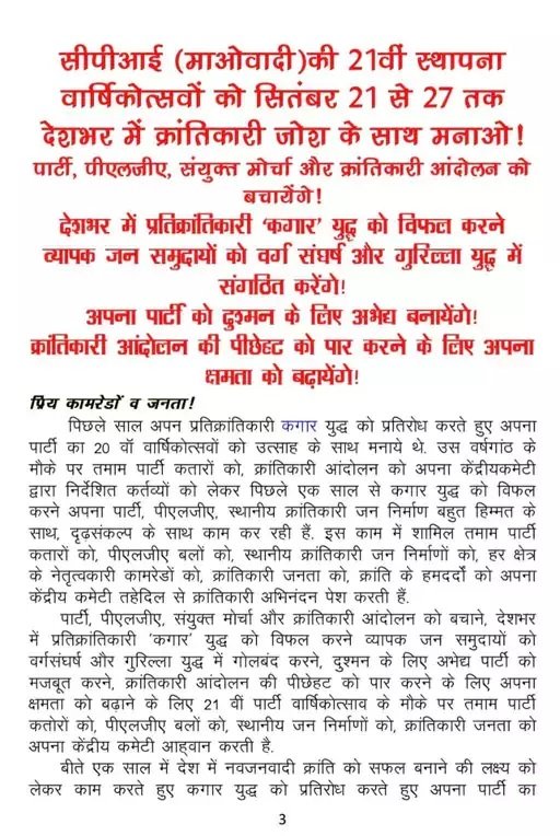 दरअसल, नक्सलियों की सेंट्रल कमेटी के नेताओं ने संगठन के लोगों को 21 सितंबर से लेकर 27 सितंबर तक CPI माओवादी की 21वीं स्थापना दिवस मनाने को कहा है। साथ ही नक्सलियों के खिलाफ चलाए जा रहे फोर्स के सारे ऑपरेशंस को विफल करने कहा है। नक्सलियों की इस बुकलेट से यह स्पष्ट है कि वे किसी बड़े हमले की तैयारी कर रहे हैं।