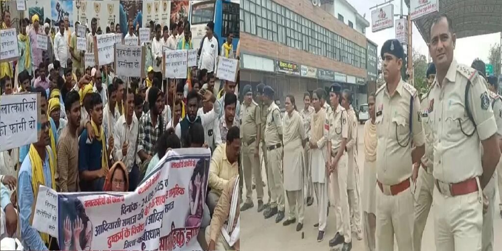 कवर्धा: आदिवासी युवती के साथ हुए सामूहिक बलात्कार की घटना के बाद पूरे कवर्धा में आक्रोश है। आज आदिवासी समाज ने सड़क पर उतरकर पीड़िता को मुआवजा और आरोपियों की गिरफ्तारी की मांग को लेकर जोरदार प्रदर्शन किया। प्रदर्शन और धरने के कारण सिग्नल चौक पर यातायात ठप हो गया। प्रशासन को चेतावनी दी गई कि अगर कार्रवाई नहीं हुई तो आंदोलन और उग्र होगा।
