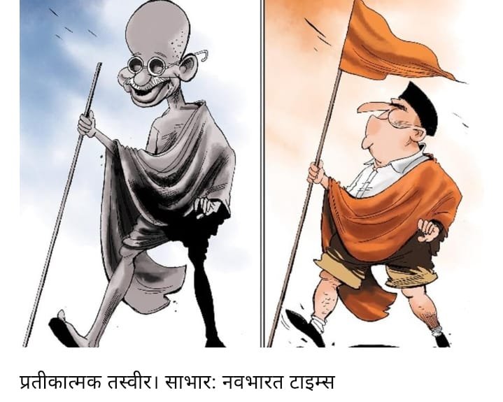 अचानक हैप्पी बर्थ डे का शोर सुना, तो बापू कुछ हड़बड़ा से गए। क्या शोर है, कुछ समझ में आया, तो इधर-उधर देखने लगे, किस का बर्थ डे? पर संघ पुरुष ने झट कंफ्यूजन दूर कर दिया। बापू जी इधर-उधर क्या देख रहे हैं — आप को ही हैप्पी बर्थ डे। बापू और सकुचा गए — सभी जानते हैं कि मैंने तो जन्म दिन वगैरह कभी नहीं मनाया। संघ पुरुष को आशंका हुई, कहीं बापू उठकर न चले जाएं। झट से बोला — वैसे जन्म दिन मनाते तो हम भी कहां हैं? बस नागपुर में सरसंघचालक जी का उद्बोधन …। अब बापू को पूछना ही पड़ा — आज आपका भी जन्म दिन है? संघ पुरुष ने चहक के कहा — सौवां जन्म दिन। पहचाना नहीं — संघ? बापू बोले — हां! कुछ-कुछ पहचाना सा तो मुझे भी लग रहा था। आपने याद दिला दिया, तो अब काफी कुछ याद आ गया।