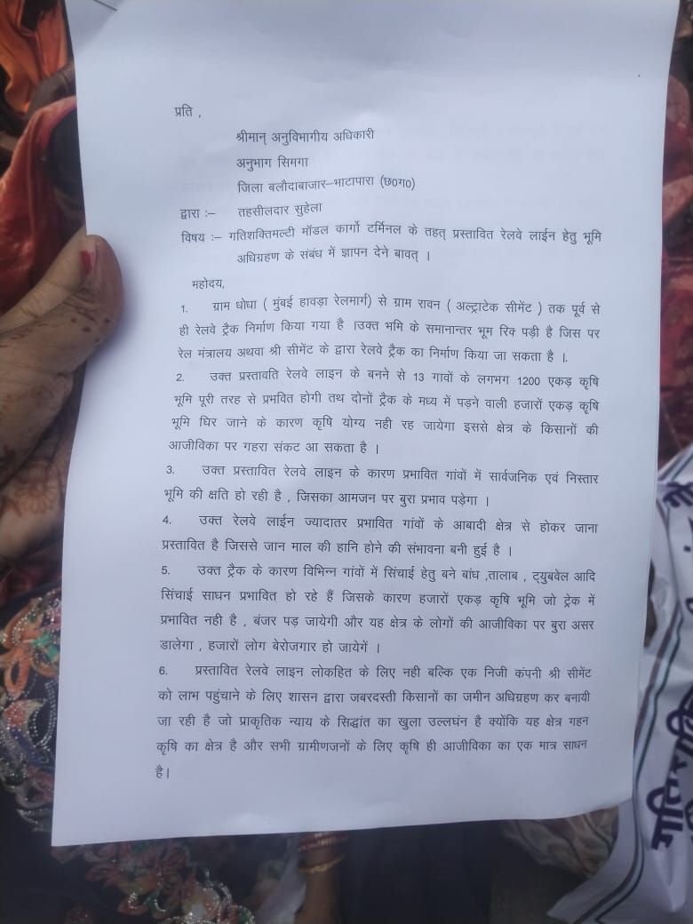 सुहेला/सिमगा। प्रस्तावित गतिशील मल्टी मॉडल कार्गो लिमिटेड परियोजना के तहत रेलवे लाइन बिछाने के लिए की जा रही भूमि अधिग्रहण प्रक्रिया का विरोध लगातार तेज होता जा रहा है। ग्राम धोधा (पूर्व केबिन )से लेकर ग्राम खपराडीह तक निर्धारित रेलवे कॉरिडोर से प्रभावित किसानों ने 15 अक्टूबर को नवापारा से सुहेल तक पैदल यात्रा कर विशेष विरोध प्रदर्शन किया।