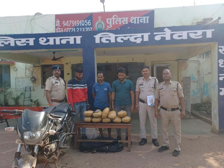 नशे के खिलाफ रायपुर पुलिस की सख्त कार्रवाई लगातार जारी है। पुलिस महानिरीक्षक रायपुर रेंज अमरेश मिश्रा और वरिष्ठ पुलिस अधीक्षक डॉ. लाल उमेद सिंह के निर्देश पर चल रहे विशेष अभियान “ऑपरेशन निश्चय” के तहत एक बार फिर बड़ी सफलता हाथ लगी है। रविवार को एण्टी क्राइम एंड साइबर यूनिट (ACCU) और थाना तिल्दा नेवरा पुलिस की संयुक्त टीम ने कार्रवाई करते हुए तीन गांजा तस्करों को रंगे हाथ गिरफ्तार किया है। आरोपियों के कब्जे से 10.629 किलोग्राम गांजा, एक पल्सर मोटरसाइकिल और दो मोबाइल फोन जब्त किए गए हैं। जब्त कुल सामान की कीमत करीब 2 लाख 10 हजार रुपए आंकी गई है।