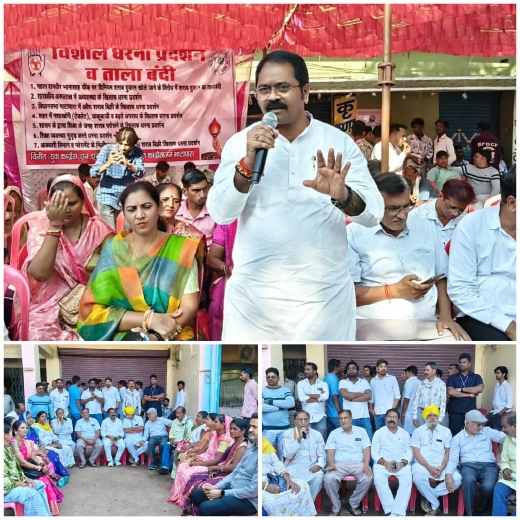 धरने में भारी संख्या में कांग्रेसजन एवं नगरवासी उपस्थित रहे। इस दौरान जनसैलाब ने “शराब दुकान बंद करो”, “जनविरोधी सरकार मुर्दाबाद”, “भाटापारा की शांति लौटाओ” जैसे नारे लगाकर विरोध प्रदर्शन को और तेज किया।