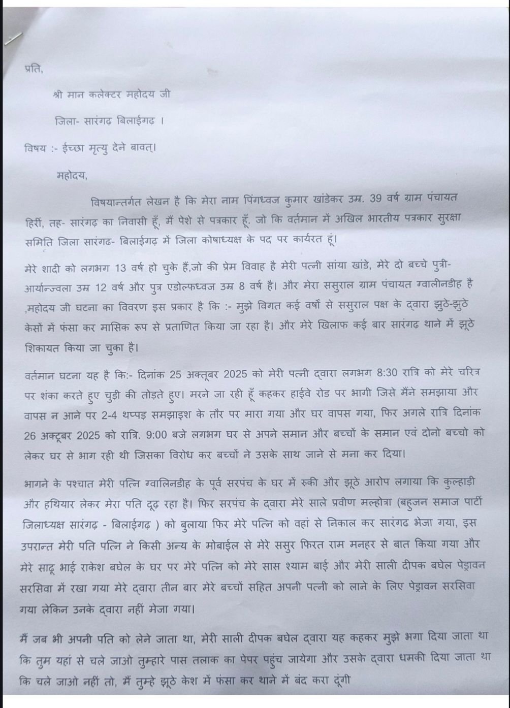 सारंगढ़ / सारंगढ़ जिले मे एक सनसनीखेज मामला सामने आया है जहाँ अखिल भारतीय पत्रकार सुरक्षा समिति के जिला कोषाध्यक्ष पिंगध्वज खांडेकर ने अपने ऊपर लगे झूठे आरोपों से आहत होकर कलेक्टर को आवेदन देकर इच्छा मृत्यु की मांग की है।