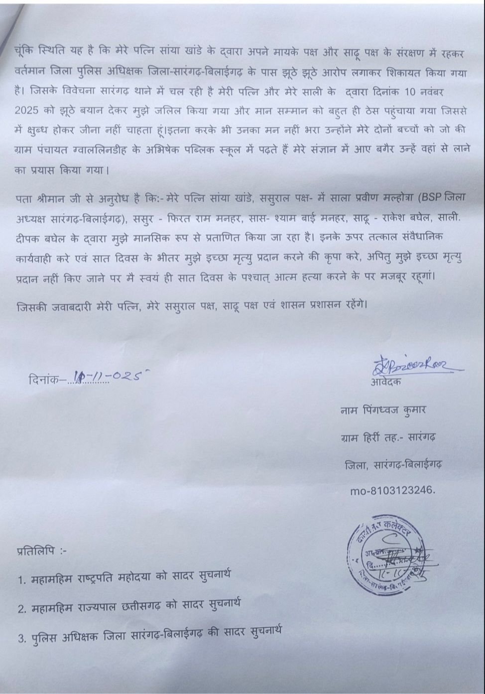 मानसिक रूप से टूट चुके पिंगध्वज ने अपने पत्र में लिखा —“यदि मुझे न्याय नहीं मिला तो मैं सात दिवस के पश्चात अपने जीवन का अंत करने के लिए विवश हो जाऊँगा। मेरी मौत की जिम्मेदारी मेरी पत्नी और ससुराल पक्ष, साढु पक्ष और शासन प्रशासन की होगी।”
