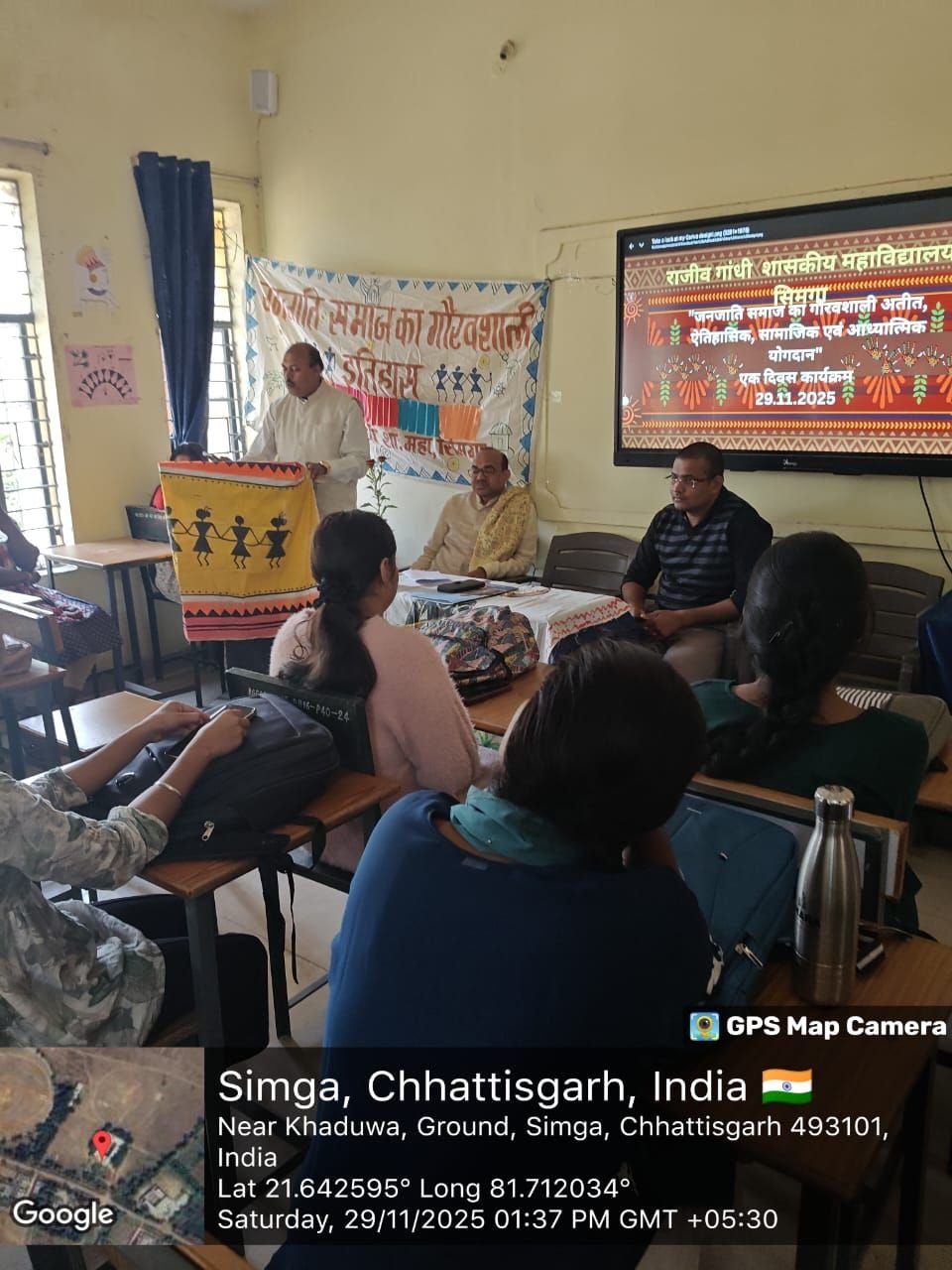 दिलीप वर्मा _ जिला रिपोर्टर //राजीव गांधी शासकीय महाविद्यालय सिमगा में दिनांक 29 जनवरी 2025 को “जनजातीय समाज का गौरवशाली अतीत, ऐतिहासिक, सामाजिक एवं आध्यात्मिक योगदान” विषय पर एक महत्वपूर्ण एवं ज्ञानवर्धक व्याख्यान का आयोजन किया गया। इस कार्यक्रम का उद्देश्य जनजातीय समाज की ऐतिहासिक धरोहर, सांस्कृतिक समृद्धि, सामाजिक संरचना तथा आध्यात्मिक जीवन-दृष्टि से विद्यार्थियों एवं शैक्षणिक समुदाय को परिचित कराना था।