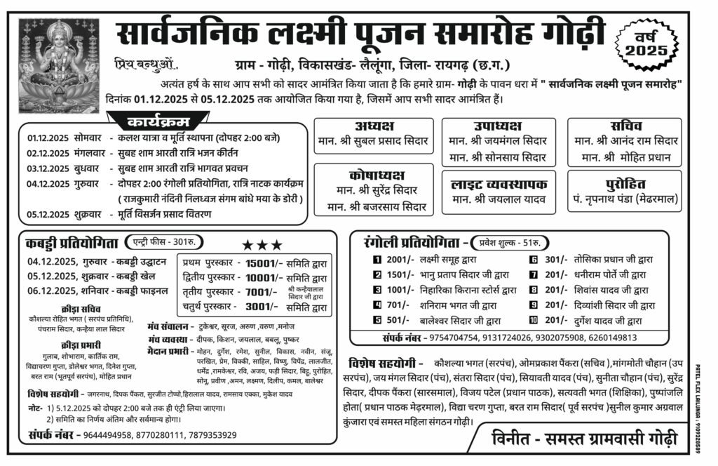 लैलूंगा: रायगढ़ जिले के लैलूंगा विकासखंड के अंतर्गत आने वाले ग्राम पंचायत खार के आश्रित ग्राम पंचायत गोढ़ी में प्रत्येक वर्ष कि भातीं इस वर्ष भी माता लक्ष्मी कि पूजन समारोह बड़े ही धूम धाम से मनाया जा रहा है जिसमें पूरे लैलूंगा विकासखंड के लोग इस कार्यक्रम को आनंद लेने के लिए पहुंचते हैं, ग्राम कि एकजुटता का परिचय है कि पूरे गांव के लोगों मिल जुल कर यह कार्यक्रम आयोजित करते हैं, गोढ़ी गांव में अधिकांश आदिवासियों का प्रमुख गांव है एवं अन्य वर्ग के लोग भी निवासरत हैं,युवाओं कि अहम भूमिका से यह कार्यक्रम आयोजित होती है,जन जनप्रतिधि विधायक, मंत्री लोगों का भी इस कार्यक्रम में शामिल होने के लिए आमंत्रित करते हैं इसी कारण यह कार्यक्रम चार चांद लग जाते हैं एवं भीड़ भी हजारों लोगों कि लगती है, यह लक्ष्मी पूजा केवल गांव कि मनोरंजन ही नहीं बल्कि गांव कि भक्ति कि आराधना के प्रति अपनी पहचान बनाई है माता लक्ष्मी पूजा का मूर्ति स्थापना कर एक सप्ताह से पूजा अर्चना किया जाता है जिससे गांव में सुख समृद्धि रहने के लिए माता लक्ष्मी वरदान देती है।