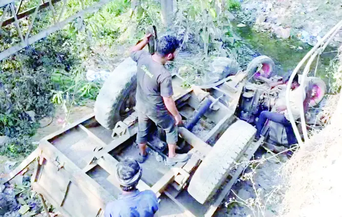 रेत से भरी टैक्टर ट्राली तेज रफ्तार में ढिमरापुर से उर्दना की ओर जा रहा था तभी आते समय पुल के पास मोटर साइकिल को देख का बेकाबू हुआ और पुल के पास ट्राली पलट गई ट्रॉली पलटने के बाद दो लोग रेत की नीचे दब गए रेत को इधर उधर फेका और दो मजदूर को बाहर निकाला और वहां के लोग कोतवाली पुलिस को सूचना दी गई