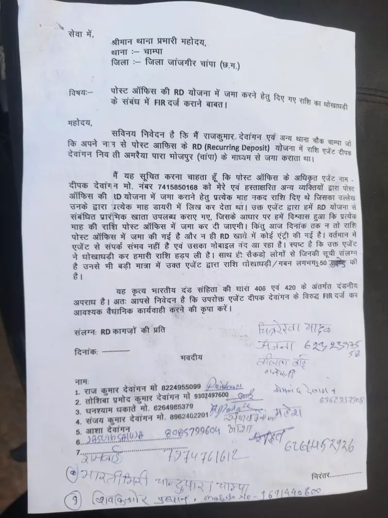 पीड़ित राजकुमार जैसे काई लोगों को निवेशकों में पुलिस को दिया गया आवेदन में बताया गया कि वे (lndia post) का RD योजना में पैसा जमा कर रहा था। और आरोपी एजेंट ने हर माह का नगद रकम को अपने डायरी में एंट्री करता था।