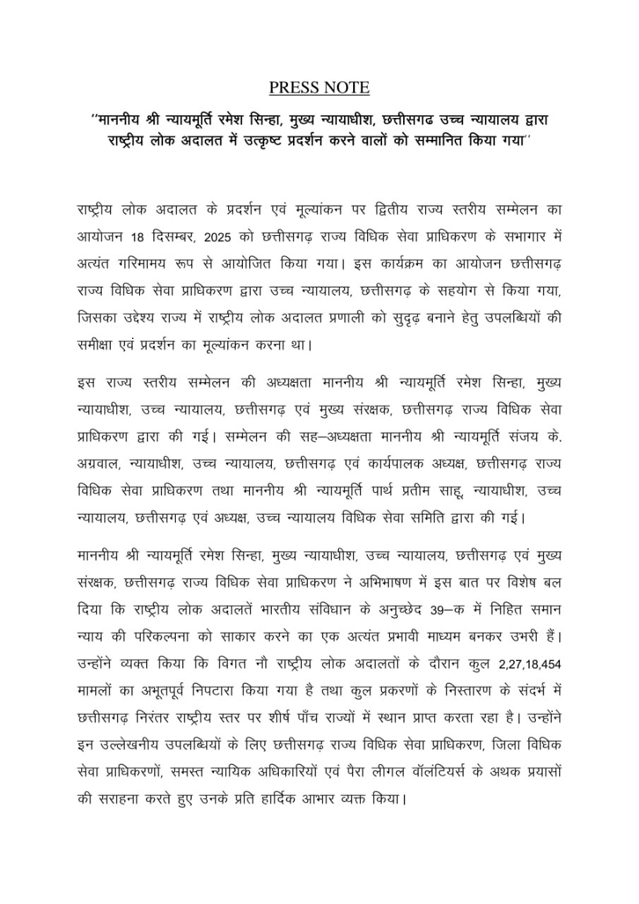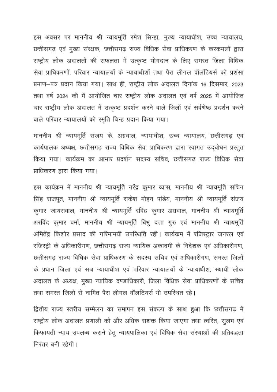 राष्ट्रीय लोक अदालत के प्रदर्शन एवं मूल्यांकन पर द्वितीय राज्य स्तरीय सम्मेलन का आयोजन 18 दिसम्बर, 2025 को छत्तीसगढ़ राज्य विधिक सेवा प्राधिकरण के सभागार में अत्यंत गरिमामय रूप से आयोजित किया गया। इस कार्यक्रम का आयोजन छत्तीसगढ़ राज्य विधिक सेवा प्राधिकरण द्वारा उच्च न्यायालय, छत्तीसगढ़ के सहयोग से किया गया, जिसका उद्देश्य राज्य में राष्ट्रीय लोक अदालत प्रणाली को सुदृढ़ बनाने हेतु उपलब्धियों की समीक्षा एवं प्रदर्शन का मूल्यांकन करना था ।