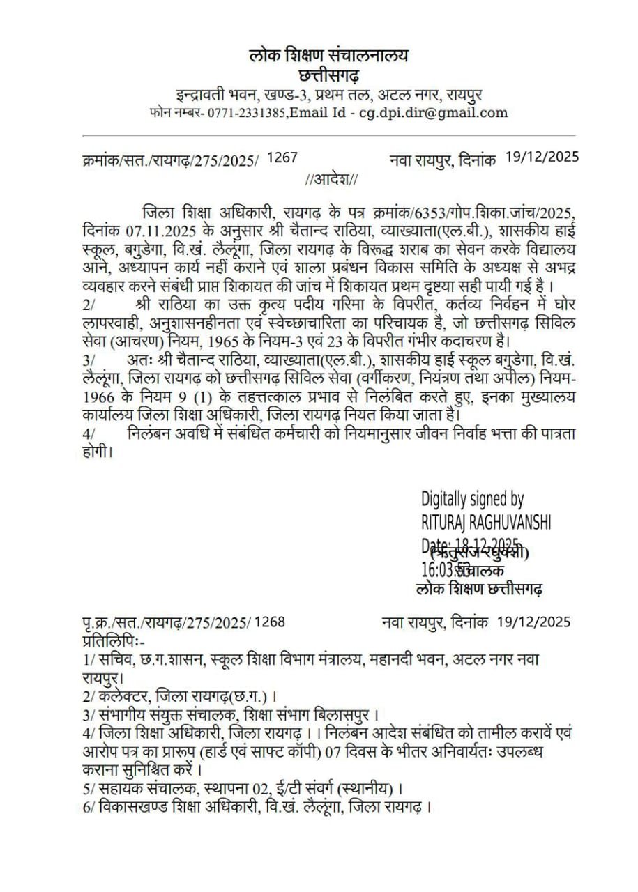 इन तथ्यों को गंभीर मानते हुए लोक शिक्षण संचालनालय ने दिनांक 19 दिसंबर 2025 को श्री चेतानंद राठिया को तत्काल प्रभाव से निलंबित करने का आदेश जारी किया। निलंबन अवधि में उनका मुख्यालय कार्यालय जिला शिक्षा अधिकारी, रायगढ़ निर्धारित किया गया है। साथ ही नियमानुसार निलंबन भत्ता दिए जाने का उल्लेख भी आदेश में किया गया है।