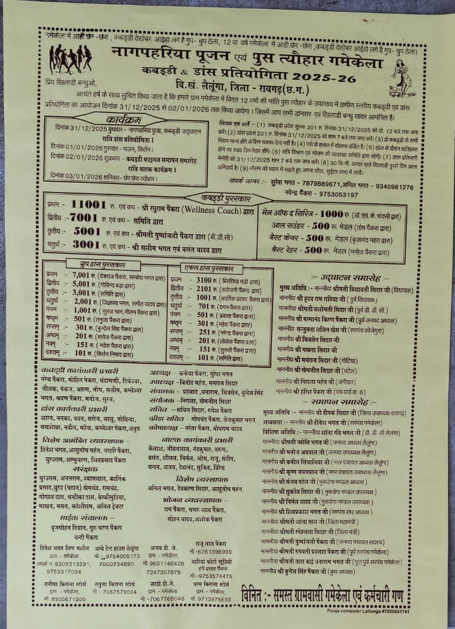 लैलूंगा: लैलूंगा विकासखंड के अंतर्गत आने वाले ग्राम पंचायत गमेकेला में प्रत्येक वर्ष कि भांति इस तरह भी बड़े धूम धाम से नागपहरिया पूजन का आयोजन किया जाएगा 31/12/2025 से 02/01/26 तक कबड्डी प्रतियोगिता एवम् रात्रि कालीन रंगारंग डांस प्रतियोगिता 01/01/26 आयोजित किए जाएंगे,पूरे गांव मिलकर यह कार्यक्रम आयोजित करते हैं,और दूर दरार से लोग इस कार्यक्रम को आनंद लेने पहुंचते हैं, कबड्डी उद्घाटन में अतिथि के रूप में विद्यावती सिदार (विधायक लैलूंगा) को आमंत्रित किया गया है एवं कार्यक्रम के समापन में दीपक सिदार(जिला पंचायत उपाध्यक्ष), शांता रवि भगत(जिला पंचायत सदस्य) ज्योति भगत(जनपद अध्यक्ष)एवं भारतीय जनता पार्टी के सभी नेताओं कि गमेकेला में कार्यक्रम में शामिल होंगे एवम पूरे लैलूंगा विकासखंड को निमंत्रण दे कर इस कार्यक्रम को गति देंगे।