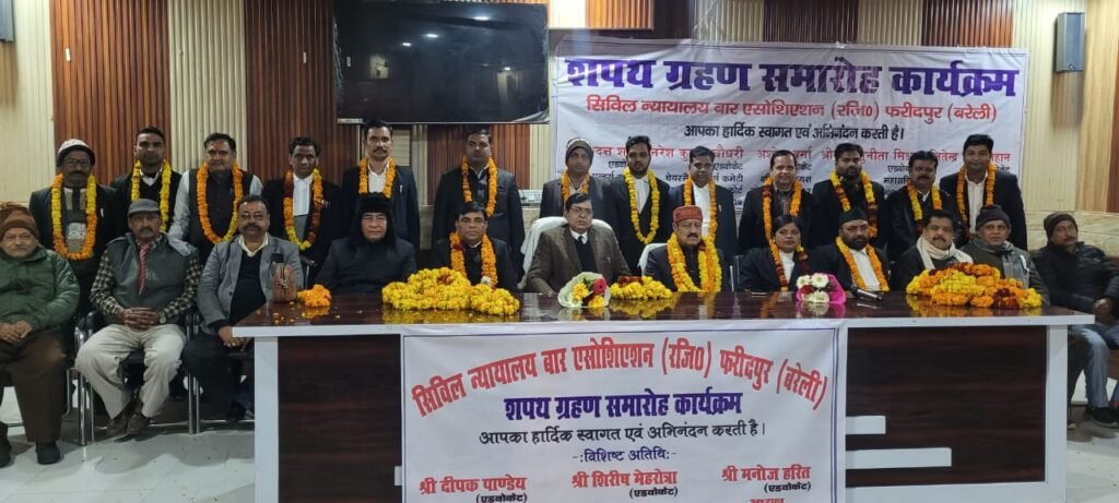 बरेली के फरीदपुर में सिविल न्यायालय बार एसोसिएशन (रजि.) फरीदपुर के द्विवार्षिक चुनाव वर्ष 2026-27 के तहत निर्विरोध निर्वाचित पदाधिकारियों का शनिवार शाम शपथ ग्रहण समारोह आयोजित किया गया। इस अवसर पर जितेंद्र सिंह चौहान एडवोकेट ने अध्यक्ष पद की शपथ ली, जबकि श्रीमती सुनीता मिश्रा एडवोकेट महासचिव बनीं।