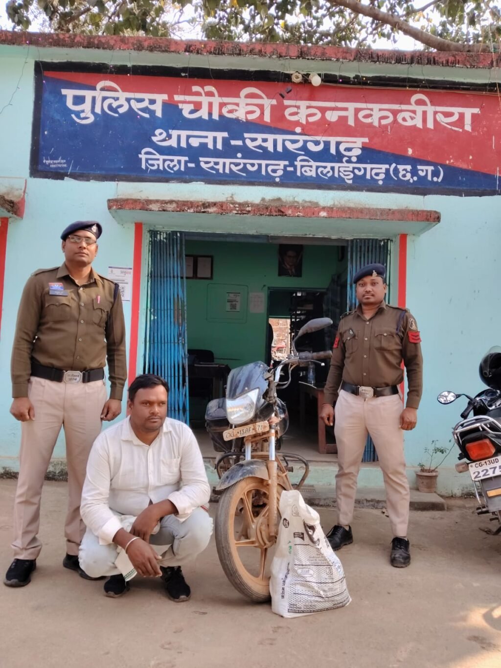 पुलिस अधीक्षक श्री आंजनेय वार्ष्णेये,अति0 पुलिस अधीक्षक श्रीमती निमीषा पाण्डेय एवं एसडीओपी श्रीमती स्नेहिल साहू के द्वारा अवैध शराब बिक्री एवं परिवहन पर रोकथाम हेतु लगातार निर्देशित किये जाने पर चौकी प्रभारी टीकाराम खटकर के कुशल मार्ग दर्शन में चौकी कनकबीरा पुलिस के द्वारा अवैध शराब बिक्री हेतु परिवहन करने वाले व्यक्ति के विरुद्ध कार्यवाही कर गिरफ्तार करने में सफलता प्राप्त हुई।अप0क्रं0 65/2026 धारा-34(2)59(क) आबकारी एक्ट में दिनांक-12.02.2026 को मुखबिर से अवैध शराब बिक्री हेतु परिवहन करने की सूचना पर घटना स्थल ग्राम रामटेक मेनरोड के पास हमराह स्टाफ एवं गवाहन के जाकर घेराबंदी कर रेड कार्यवाही किया जिसमे एक व्यक्ति को मोटर सायकल बजाज सी टी 100 क्रमांक- सीजी-13 ए एफ-1712 मे पकड़ा गया जिसका नाम दिनेश कुमार चैहान पिता सुरताल चैहान उम्र 35 वर्ष सा0 तेंदुआ चौकी कनक बीरा थाना सारंगढ़ जिला सारंगढ़ बिलाईगढ़ छ0ग0 का निवासी होना पता चला जिसके मोटर सायकल में रखे प्लास्टीक बोरी के अंदर कच्ची महुआ शराब करीब 10 लीटर कीमती- 2000 रू का पेश किया एवं परिवहन में उपयोग मोटर सायकल को हमराह स्टाफ एवं गवाहान के जप्त किया जाकर आरोपी को विधिवत् गिरफ्तार कर न्यायिक रिमाण्ड पर जेल भेजा गया।