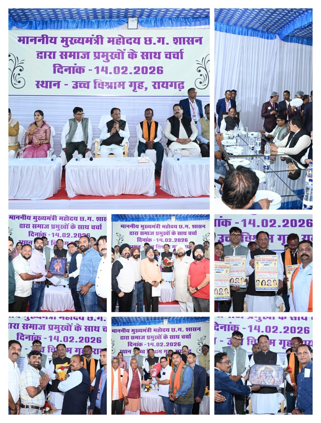रायगढ़ 14 फरवरी 2026/ मुख्यमंत्री श्री विष्णुदेव साय अपने रायगढ़ प्रवास के दौरान सर्किट हाउस में जिले के विभिन्न सामाजिक संगठनों एवं समाज प्रमुखों से आत्मीय मुलाकात कर संवाद किया। मुख्यमंत्री ने समाज के समग्र विकास में सामाजिक संगठनों की महत्वपूर्ण भूमिका को रेखांकित करते हुए कहा कि शासन की जनकल्याणकारी योजनाओं को अंतिम व्यक्ति तक पहुँचाने के लिए सभी समाजों की सक्रिय भागीदारी आवश्यक है।