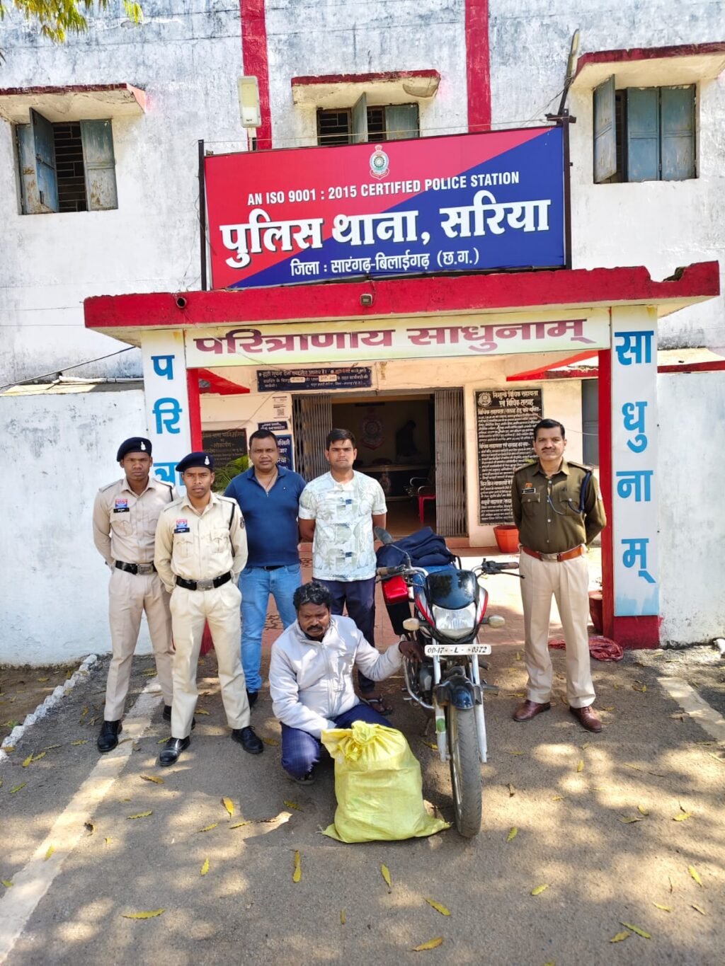 विवरण इस प्रकार है कि दिनांक 16/02/2026को दौरान पेट्रोलिंग जरिये मुखबीर सुचना मिला एक लाल रंग के HF डीलक्स मोटर सायकल क्रमांक OD 17 L 0372 का चालक उड़ीसा से गांजा लेकर ग्राम मल्दा, सारंगढ़ की तरफ जा रहा है सूचना पर सरिया थाना के सामने मेन रोड में घेराबंदी कर मोटर सायकल क्रमांक OD 17 L 0372 को पकड़ा गया।मोटर सायकल के चालक से नाम पता पूछने पर अपना नाम *धरम सिंह सिदार पिता गैंग* *सिंह सिदार उम्र 45 वर्ष ग्राम मल्दा थाना सिटी कोतवाली सारंगढ़* बताया । मोटर सायकल में पीछे बंधे प्लास्टिक बोरी तथा डिक्की की तलाशी लेने पर 07 पैकेट में कुल 08किलो 240 ग्राम अवैध मादक पदार्थ गांजा मिला। आरोपी से पूछताछ करने पर जिला कंटामाल उड़ीसा से गांजा लेकर ग्राम मल्दा ,थाना सिटी कोतवाली सारंगढ़ बिक्री हेतु ले जाना बताया कि आरोपी धरम सिंह सिदार के कब्जे से 08किलो 240 ग्राम अवैध मादक पदार्थ गांजा, 01नग HF डीलक्स मोटर सायकल क्रमांक OD 17 L 0372, एक नग मोबाइल को जप्त कर आरोपी के खिलाफ थाना सरिया मे अपराध क्रमांक 29/2026 धारा 20 बी एनडीपीएस एक्ट पंजीबद्ध कर आरोपी को विधिवत् गिरफ्तार कर न्यायिक रिमांड पर जेल भेजा गया है।