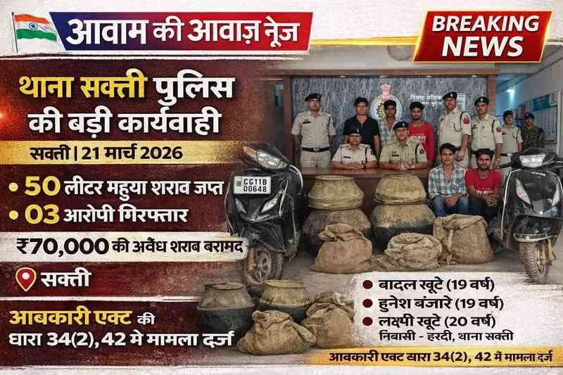 सक्ती पुलिस ने अवैध महुआ शराब के खिलाफ बड़ी कार्रवाई करते हुए 03 आरोपियों को गिरफ्तार किया है। आरोपी कच्ची महुआ शराब बनाकर उसका परिवहन कर रहे थे।