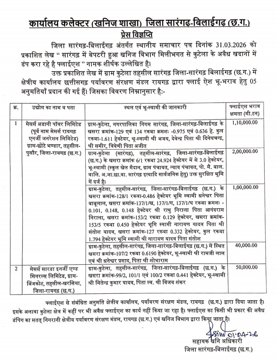 सारंगढ़-बिलाईगढ़ जिले के ग्राम कुटेला में फ्लाई ऐश डंपिंग को लेकर चल रही चर्चाओं के बीच प्रशासन ने स्थिति स्पष्ट की है। जानकारी के अनुसार, पुराने पत्थर खदानों में फ्लाई ऐश डंपिंग की अनुमति नहीं दी गई है, बल्कि शासकीय एवं निजी गड्ढेयुक्त भूमि पर भू-भराव के उद्देश्य से अनुमति जारी की गई है।