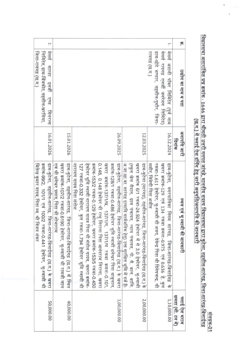 अधिकारियों के मुताबिक, फ्लाई ऐश का उपयोग गड्ढेयुक्त भूमि को समतल एवं उपयोगी बनाने के लिए किया जा रहा है। यह अनुमति क्षेत्रीय कार्यालय, छत्तीसगढ़ पर्यावरण संरक्षण मंडल रायगढ़ द्वारा केंद्र सरकार के पर्यावरण, वन एवं जलवायु परिवर्तन मंत्रालय की अधिसूचना (31 दिसंबर 2021) एवं राज्य स्तर पर जारी दिशा-निर्देशों के अनुसार प्रदान की गई है।
