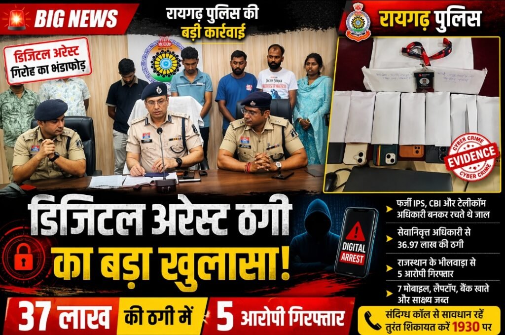 рд░рд╛рдпрдЧрдврд╝ рдкреБрд▓рд┐рд╕ рдиреЗ тАЬрдбрд┐рдЬрд┐рдЯрд▓ рдЕрд░реЗрд╕реНрдЯтАЭ рдХреЗ рдирд╛рдо рдкрд░ рдХреА рдЬрд╛ рд░рд╣реА рдмрдбрд╝реА рд╕рд╛рдЗрдмрд░ рдардЧреА рдХрд╛ рдкрд░реНрджрд╛рдлрд╛рд╢ рдХрд░рддреЗ рд╣реБрдП рд░рд╛рдЬрд╕реНрдерд╛рди рдХреЗ рднреАрд▓рд╡рд╛рдбрд╝рд╛ рд╕реЗ рдорд╣рд┐рд▓рд╛ рд╕рд╣рд┐рдд рдкрд╛рдВрдЪ рдЕрдВрддрд░реНрд░рд╛рдЬреНрдпреАрдп рдЖрд░реЛрдкрд┐рдпреЛрдВ рдХреЛ рдЧрд┐рд░рдлреНрддрд╛рд░ рдХрд┐рдпрд╛ рд╣реИред