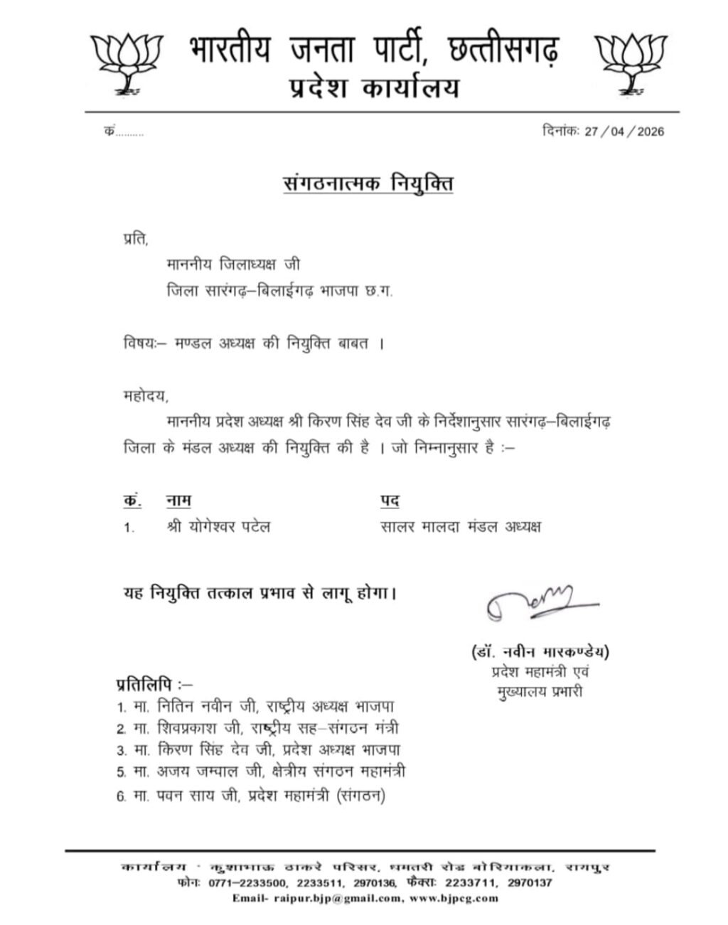 भाजपा में बड़ा संगठनात्मक बदलाव! नए मंडल अध्यक्ष की घोषणा, कार्यकर्ताओं से एकजुट होने की अपील…