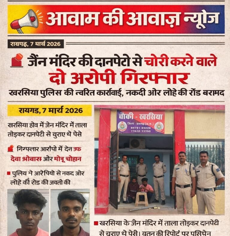 रायगढ़, 7 मार्च 2026खरसिया क्षेत्र में जैन मंदिर की दानपेटी से रुपए चोरी करने वाले दो आरोपियों को पुलिस ने...