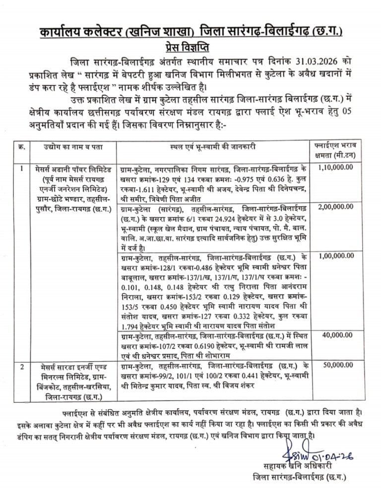 सारंगढ़-बिलाईगढ़ जिले के ग्राम कुटेला में फ्लाई ऐश डंपिंग को लेकर चल रही चर्चाओं के बीच प्रशासन ने स्थिति स्पष्ट...